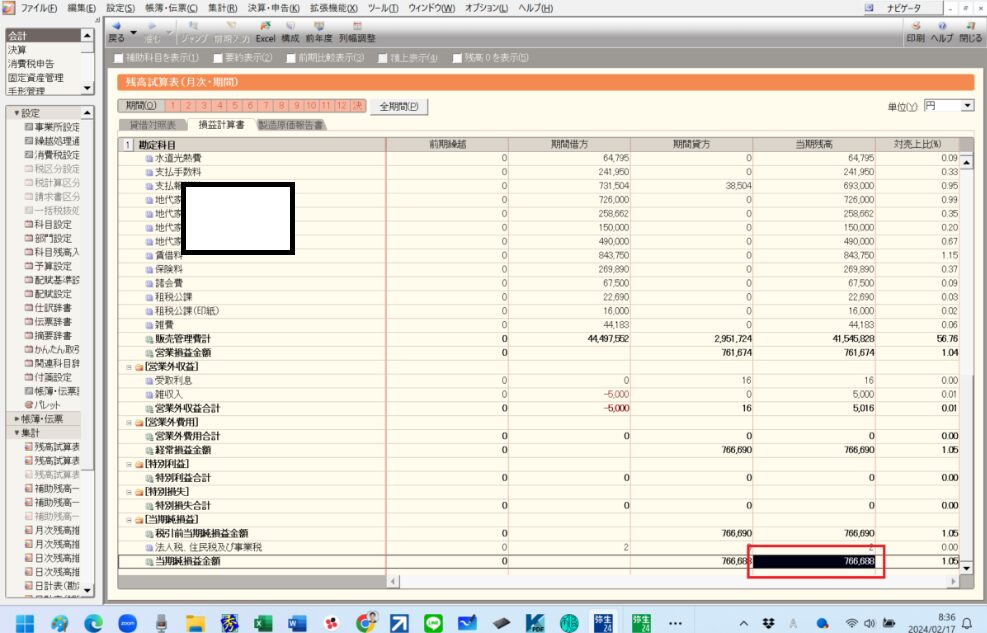 ↓年税額→会計ソフトに戻り、法人税等a/cの決算仕訳を計上する。