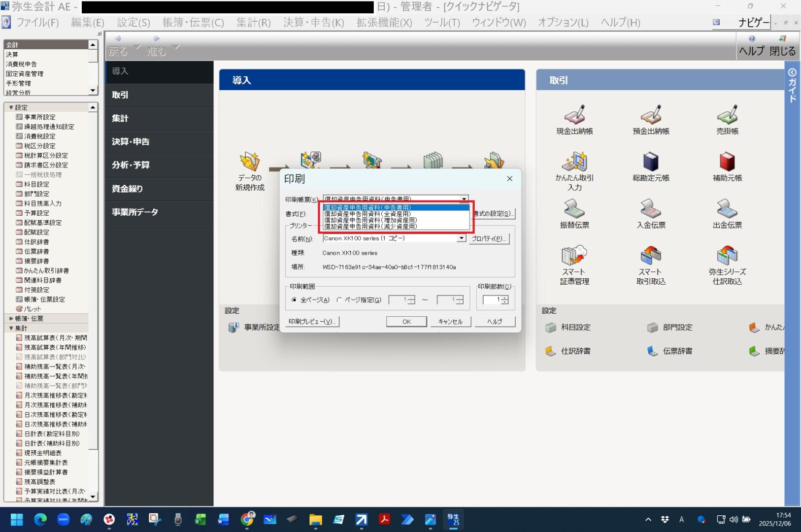 1)弥生会計AEから、拡張機能(X)→固定資産管理(F)→(上から3つ目の)償却資産申告用資料(S) → 印刷のプロパティ、で以下の4つの帳票を出力
