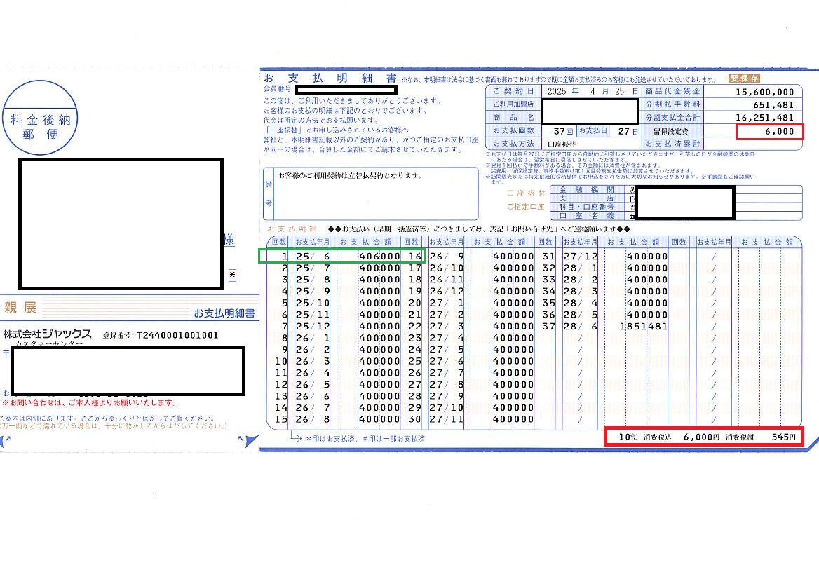 ジャックスの明細書では、初回支払額に「留保設定費」が含まれていることがあります。たとえば:
