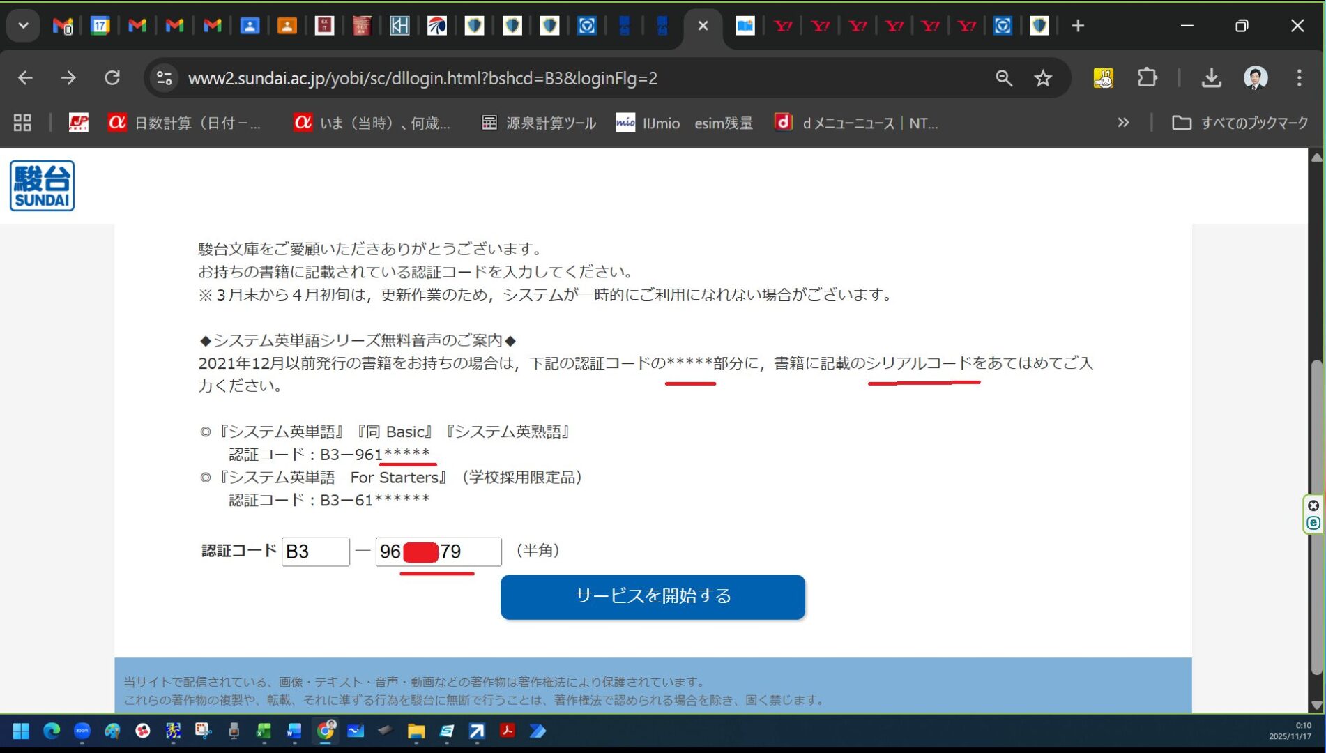 システム英単語 5訂版の無料音声のダウンロードのシリアルコードの入力をしたが、最初、うまくできず、時間がかかった。