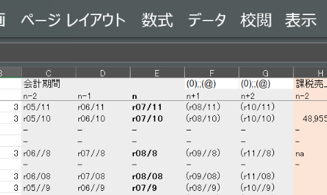 当事務所のお客様の消費税の管理簿を整備中、以下のように表示させたい。