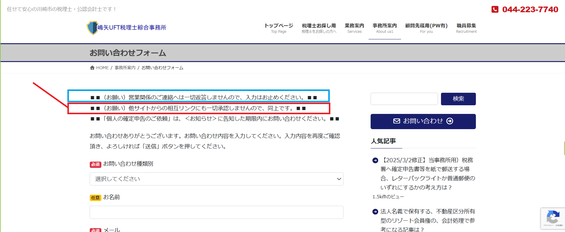 お問い合わせフォームにも、以下のとおり、紹介や相互リンク等は一切承認しない旨を明記しています。