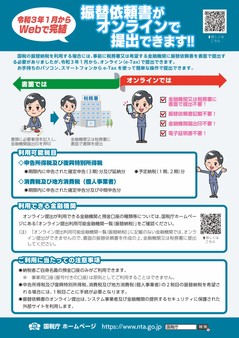 令和3年以降、口座振替の申し込みがネットだけで完結するようになりました。また、ご本人に代わって税理士が代理送信で提出可能です。(税理士用メモ:JDLの電子申告システムでは非対応のため、e-tax(web)から申請します)